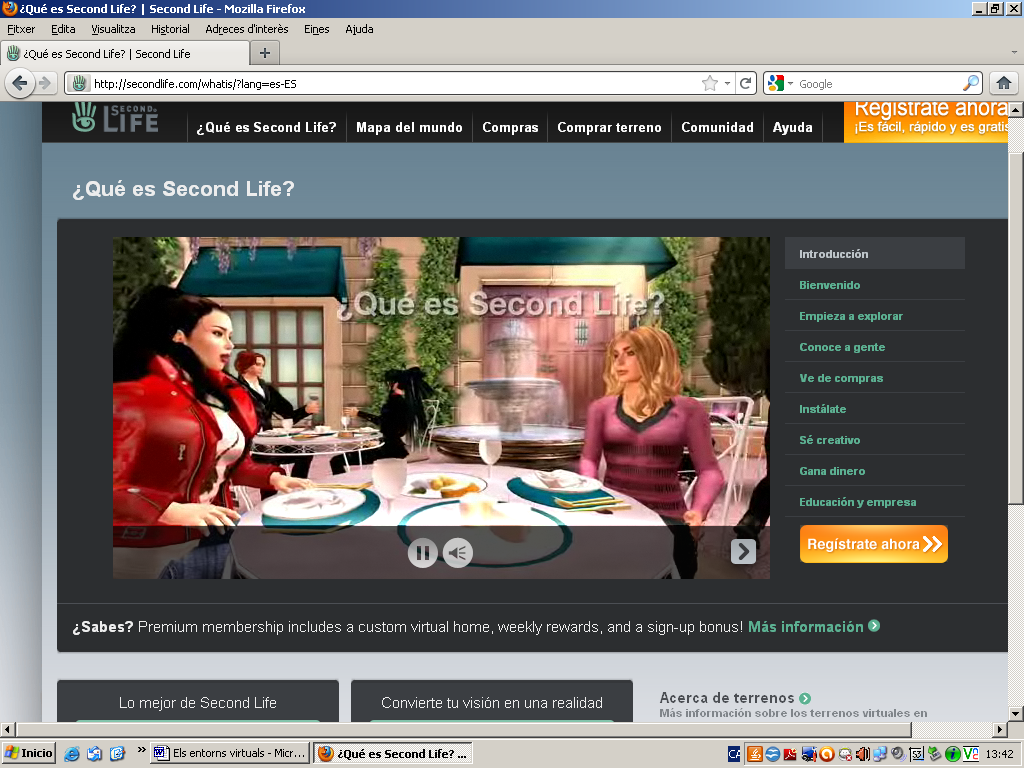 - Second Life: és un món virtual en 3D que permet a l’usuari viure una mena de vida paral·lela o de “segona vida”. La major part d’aquest món virtual és creat pels mateixos residents. No es tracta d’un joc, sinó d’un espai d’intercanvis (eventualment de joc si els usuaris ho desitgen) que pretén ser tan veritable com la vida real.