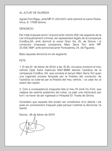 - Signatura: se signa la denúncia, no cal posar el nom de la persona, atès que ja es troba indicat en el mateix document.