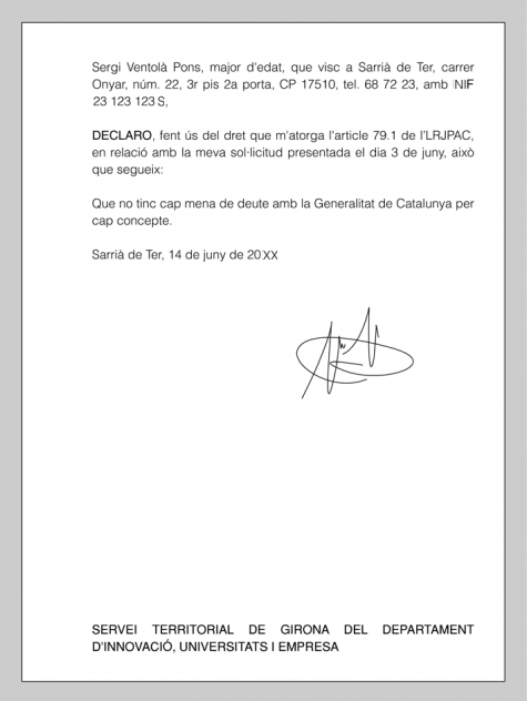 - Signatura de la persona interessada que acrediti que la sol·licitud es fa per la seva voluntat. Fixem-nos que no cal afegir el nom de la persona que signa el document, atès que aquesta informació ja consta en la part superior del certificat.