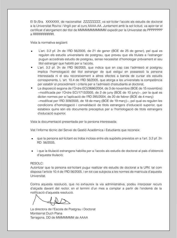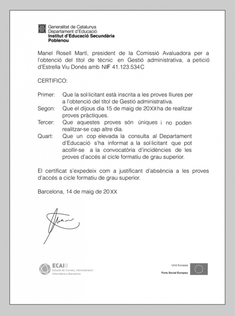- Signatura: és la corresponent a la persona que acredita el certificat. No cal que inclogui el nom ni el càrrec, atès que s’especifiquen en la part superior del document.
