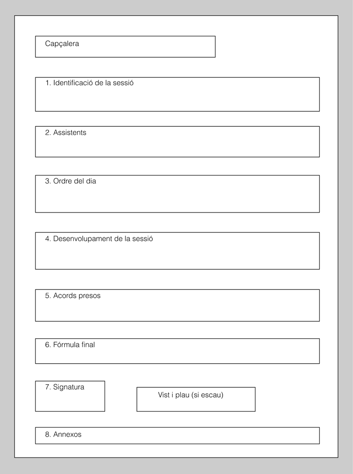 - Annexos. S’hi fan constar els informes que s’han utilitzat per tractar del punt de l’acta corresponent.