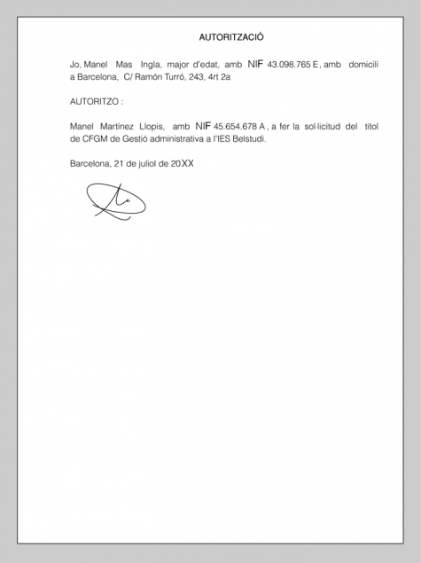 En determinades situacions ens pot ser impossible efectuar un tràmit. En aquests casos, el document d’autorització és necessari perquè una tercera persona actuï en nom nostre. En determinats tràmits amb una rellevància especial pot ser necessari que el representant disposi de poder notarial. En la figura podem veure un model d’autorització i en la figura, un exemple.