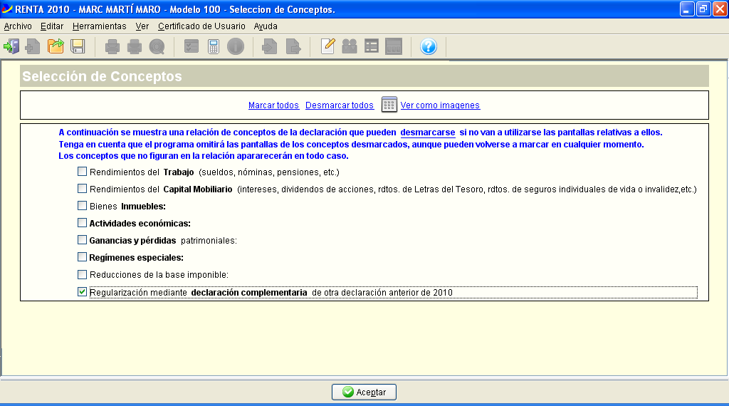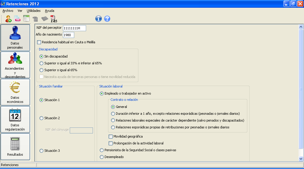 Un cop executat el programa apareixeran diferents pestanyes en què s’agrupen les dades del treballador que s’han d’introduir. En la figura podem veure la pantalla corresponent a l’aplicació en què hem anat posant les dades personals. L’exemple que apareix en la figura representa una persona casada amb la seva parella, que també treballa i ingressa més de 1.500 € anuals.