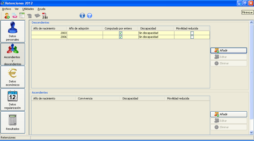 La segona pestanya del programa, que es pot veure desplegada en la figura, serveix per introduir la informació relativa als ascendents i descendents inclosa en l’apartat 2 del model 145. En l’exemple que apareix en la figura hem suposat que la persona treballadora té dos fills nascuts els anys 2003 i 2006.