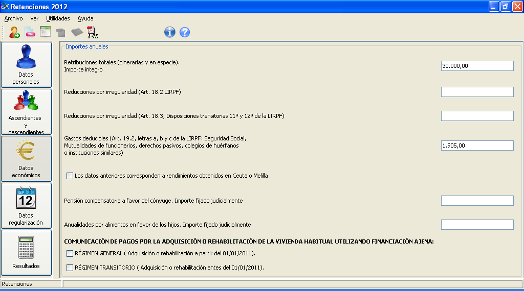 La tercera opció de l’aplicació recull la informació econòmica relativa al treballador, com es pot veure en la figura. Hi sobresurt la informació sobre les retribucions d’aquest treballador i les despeses deduïbles. En l’exemple que seguim suposem una retribució anual del treballador de 30.000 € amb unes aportacions a la Seguretat Social de 1.905 €. També hi ha l’opció de marcar la casella que indica que el treballador du a terme pagaments per adquisició o rehabilitació de l’habitatge habitual que implica deducció.