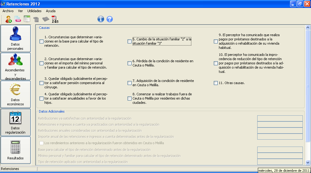 La quarta opció que permet l’aplicació és la de dades de regularització. Aquesta opció serveix per introduir modificacions al llarg de l’any en el tipus de retenció. Això és així perquè normalment l’Administració obliga a calcular el tipus a aplicar a les retencions a principi d’any, però pot passar que la situació que dóna lloc al tipus que s’aplica variï i, en conseqüència, s’hagi de modificar el tipus aplicat a fi d’adaptar-lo a la nova situació del treballador. En la figura podem veure la pantalla amb la qual es duen a terme les regularitzacions. En aquest exemple, però, no hi ha hagut cap modificació al llarg de l’any.