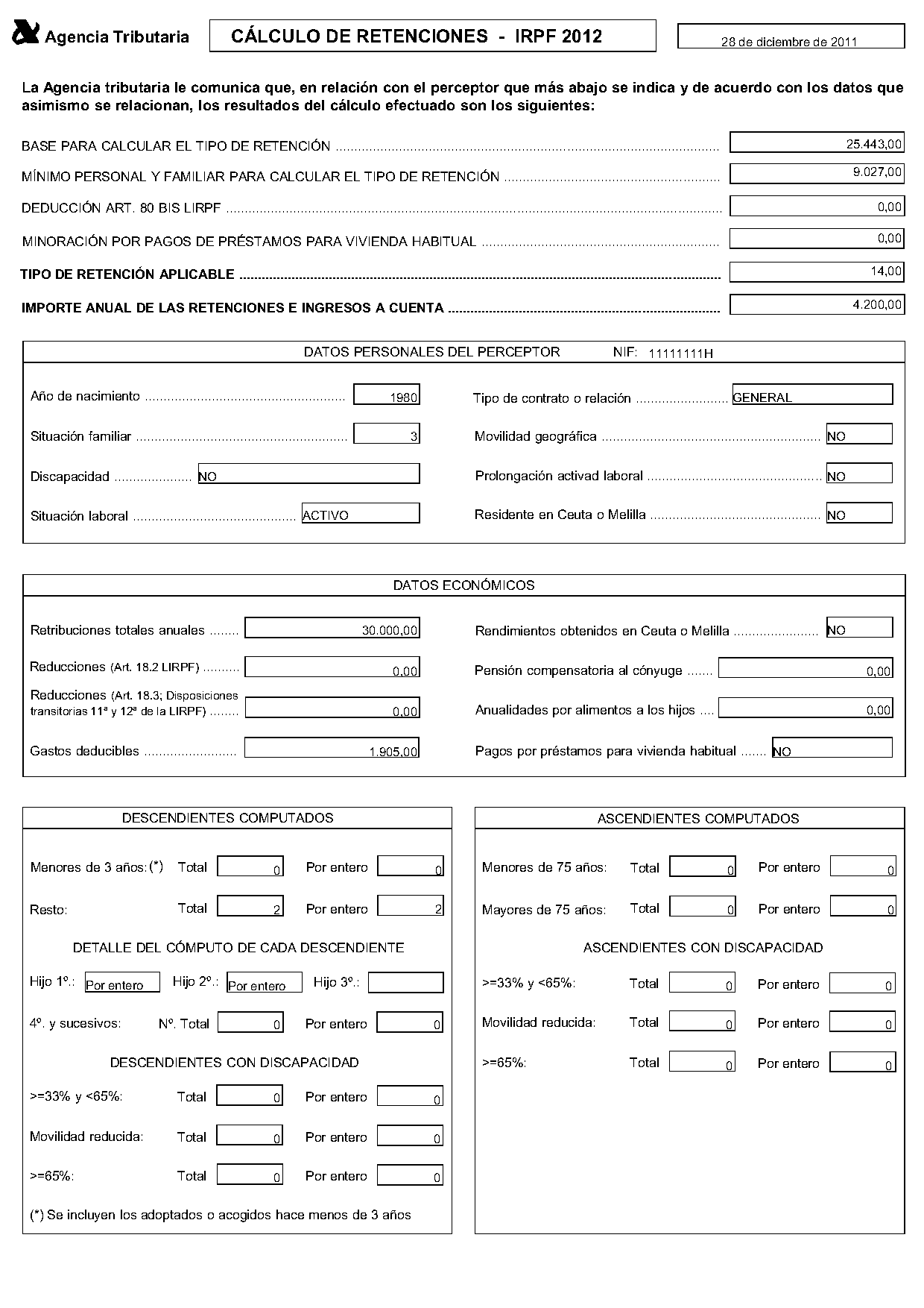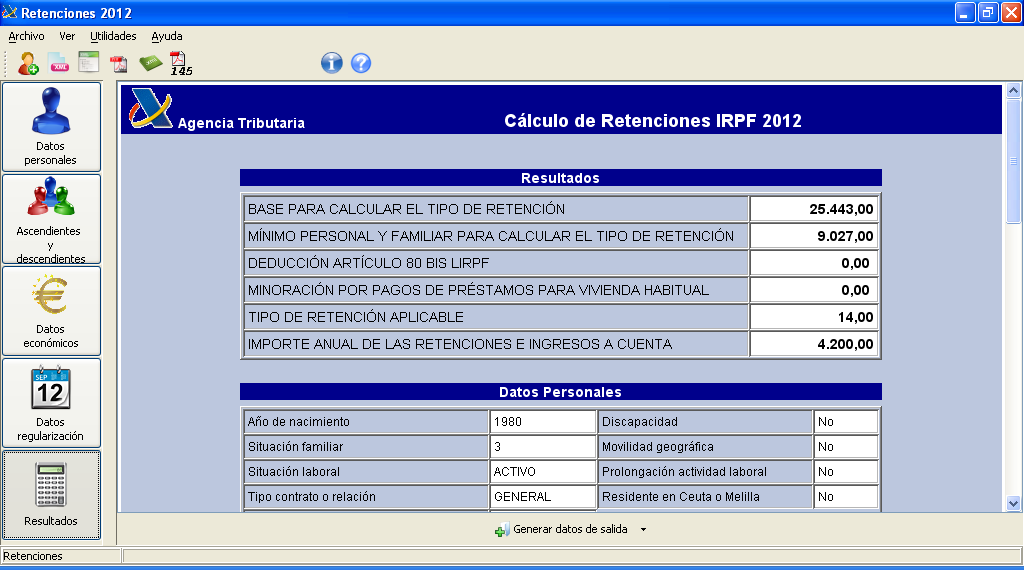 En la figura podem observar l’informe del resultat de retenció i, entre altres aspectes, podem contrastar com la retenció s’aplica sobre la totalitat de les retribucions (en l’exemple, 14% de 30.000 € = 4.200 €), i és que les deduccions i altres aspectes relatius a les circumstàncies de l’individu serveixen per calcular el tipus percentual que s’aplica, i no per alterar la base sobre la qual es calcula la retenció.