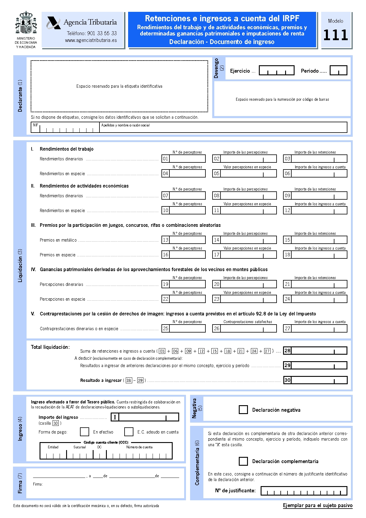 El model 111 d’hisenda es divideix en set parts: