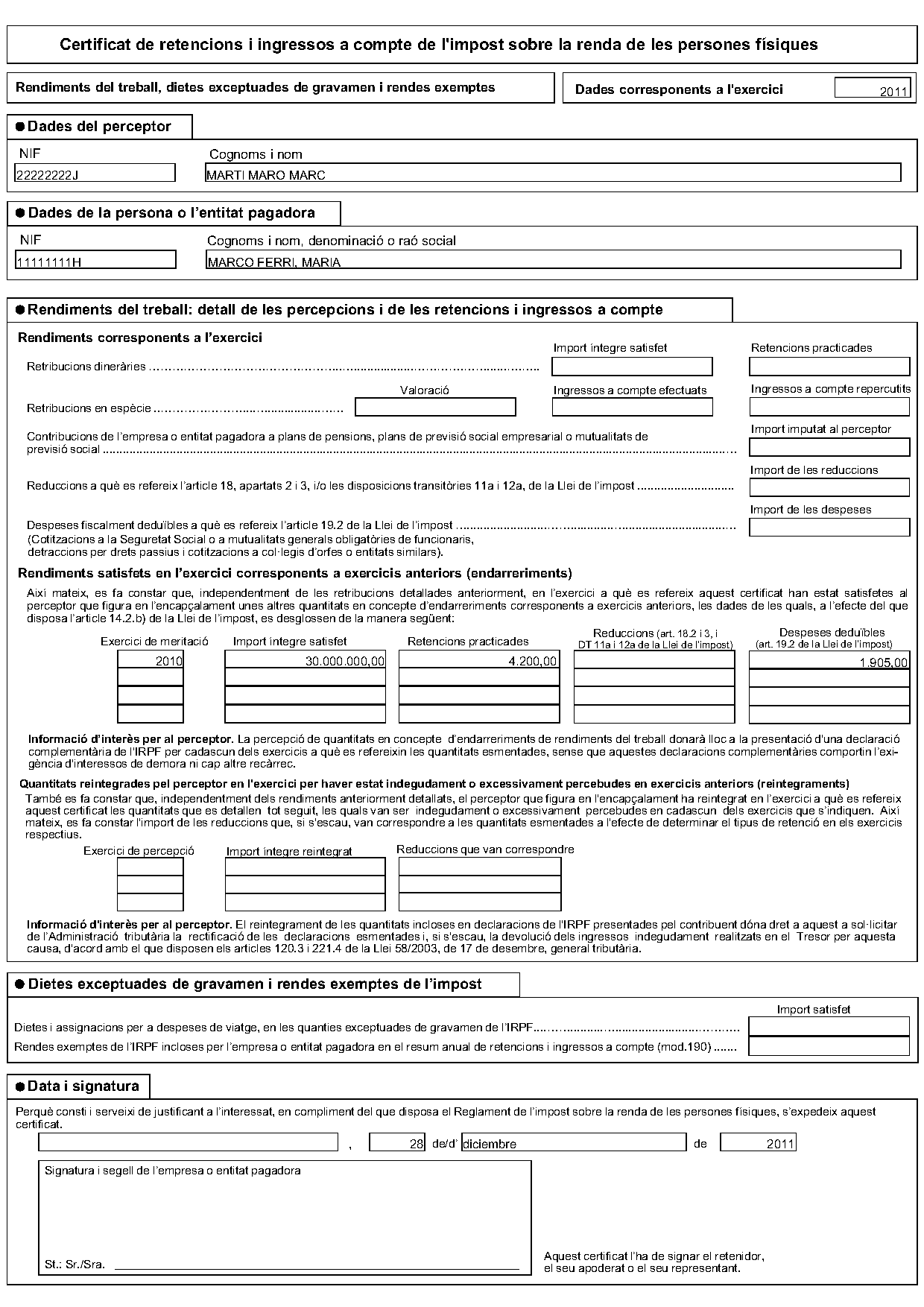 En la figura podem veure un exemple emplenat de certificat de retencions i ingressos a compte de l’IRPF.