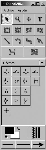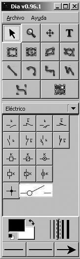 En la figura es mostra la finestra principal d’eines de Dia amb la biblioteca elèctrica i la nova forma interruptor afegida.