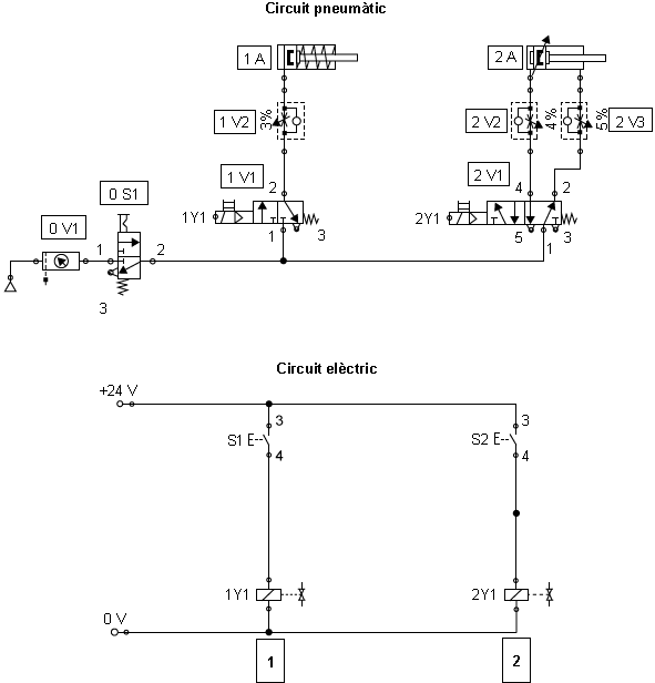 En el circuit 1, si volguéssiu que el cilindre 1A estigués comandat per l’accionament simultani de tres polsadors, hauríeu de treure el cable que va de la connexió 4 de S2 a la connexió de l’electrovàlvula i posar-hi un altre polsador (S5) posant un cable de la connexió 4 del polsador S2 al 3 de S5 i un altre cable del 4 de S5 a l’electrovàlvula.