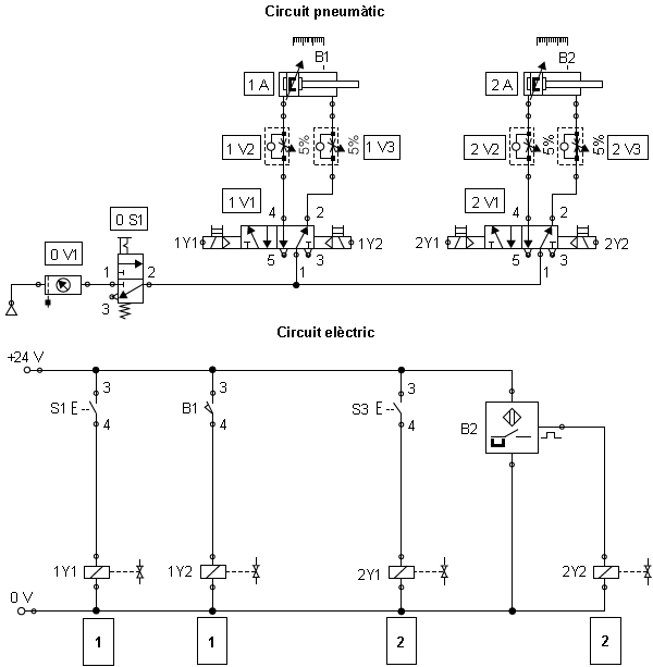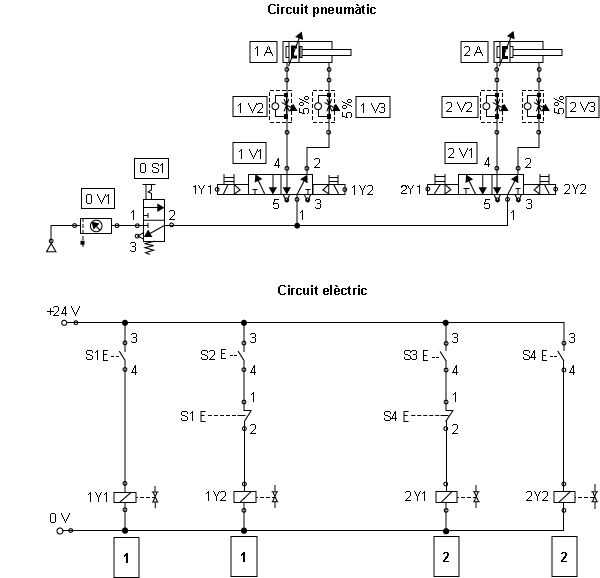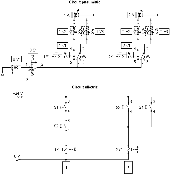 Tot i que els dos circuits tenen un funcionament semblant, són diferents. Tindreu el mateix funcionament en els dos cilindres si no accioneu de manera simultània els dos polsadors que controlen cada cilindre.