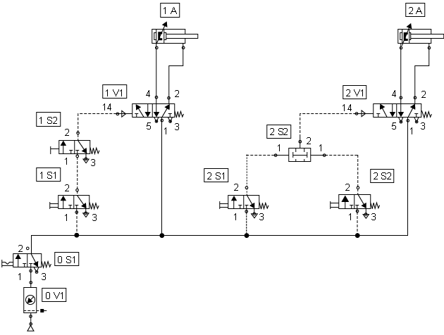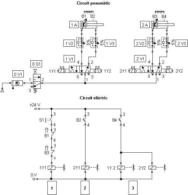 La seqüència que fa aquest circuit pneumàtic és la següent: en accionar el polsador surt el cilindre 1A, quan aquest arriba fora s’activa el detector B2, que dóna l’ordre que surti el cilindre 2A, i en arribar aquest fora activa el detector B4, que dóna l’ordre simultània que el cilindre 1A i el 2A retornin.