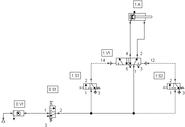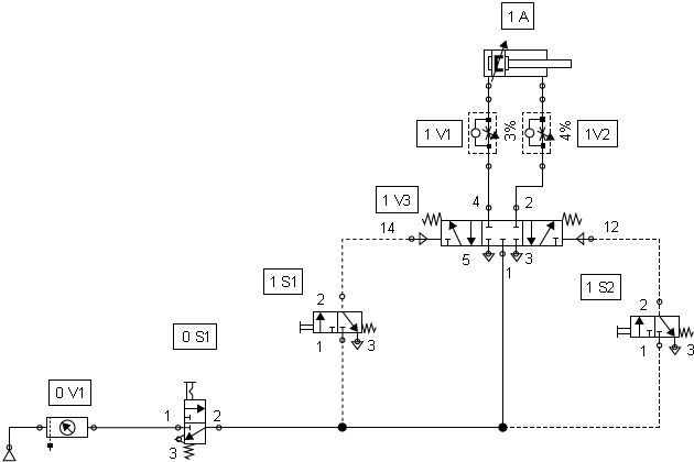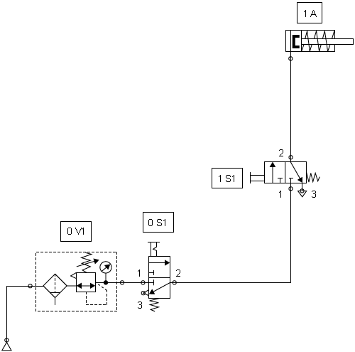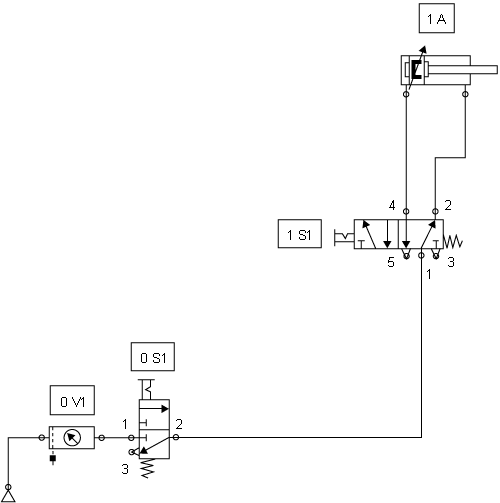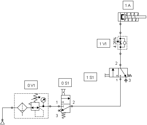 Podeu comprovar que quan accionem la vàlvula 0S1 l’aire a pressió surt per la connexió 3 de la vàlvula 1S1. Després accionem la vàlvula 1S1 i el cilindre sortirà; quan deixem d’accionar la vàlvula 1S1 podem comprovar que el cilindre queda fora amb pressió.