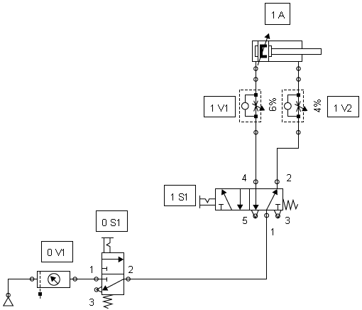 Comproveu el funcionament del circuit. Reguleu l’escanyament d’1V2 fins al 30%, el d’1V1 al 5%, accioneu la vàlvula 1S1 i llavors podreu comprovar que el cilindre surt més ràpid del que entra, ja que 1V2 (regula la sortida) està més obert que 1V1.