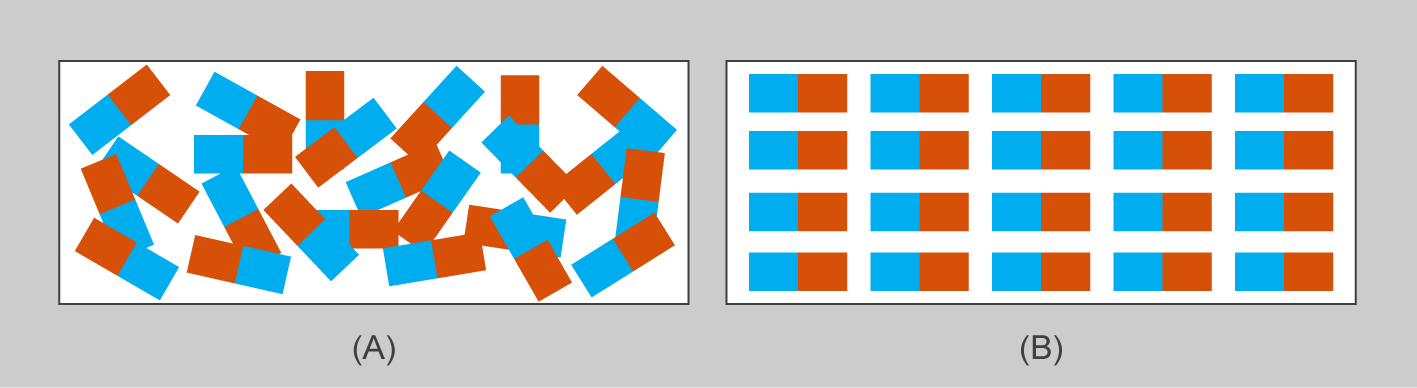 - Impossibilitat de separació dels pols. No és possible separar els dos pols d’un imant. És a dir, si el partim per la meitat, es tornen a generar dos pols en cadascuna de les dues meitats. Si repetim aquesta divisió moltes vegades, arribarem a l’estructura mínima, anomenada molècula magnètica. Aquest efecte és degut al fet que un imant és compost per molècules magnètiques que tenen els dos pols perfectament alineats, mentre que elements com el ferro tenen totes les seves molècules desorientades, de manera que els efectes es contraresten entre si (figura).