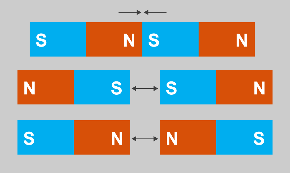 - Forces d’atracció i de repulsió. Si apropem dos imants, observarem que si ajuntem dos pols del mateix tipus es genera una força de repulsió que tendeix a separar-los. Contràriament, si apropem dos pols de diferent tipus, es genera una força d’atracció que tendeix a ajuntar-los (figura).