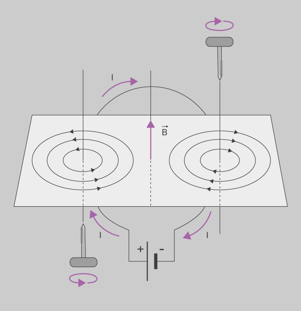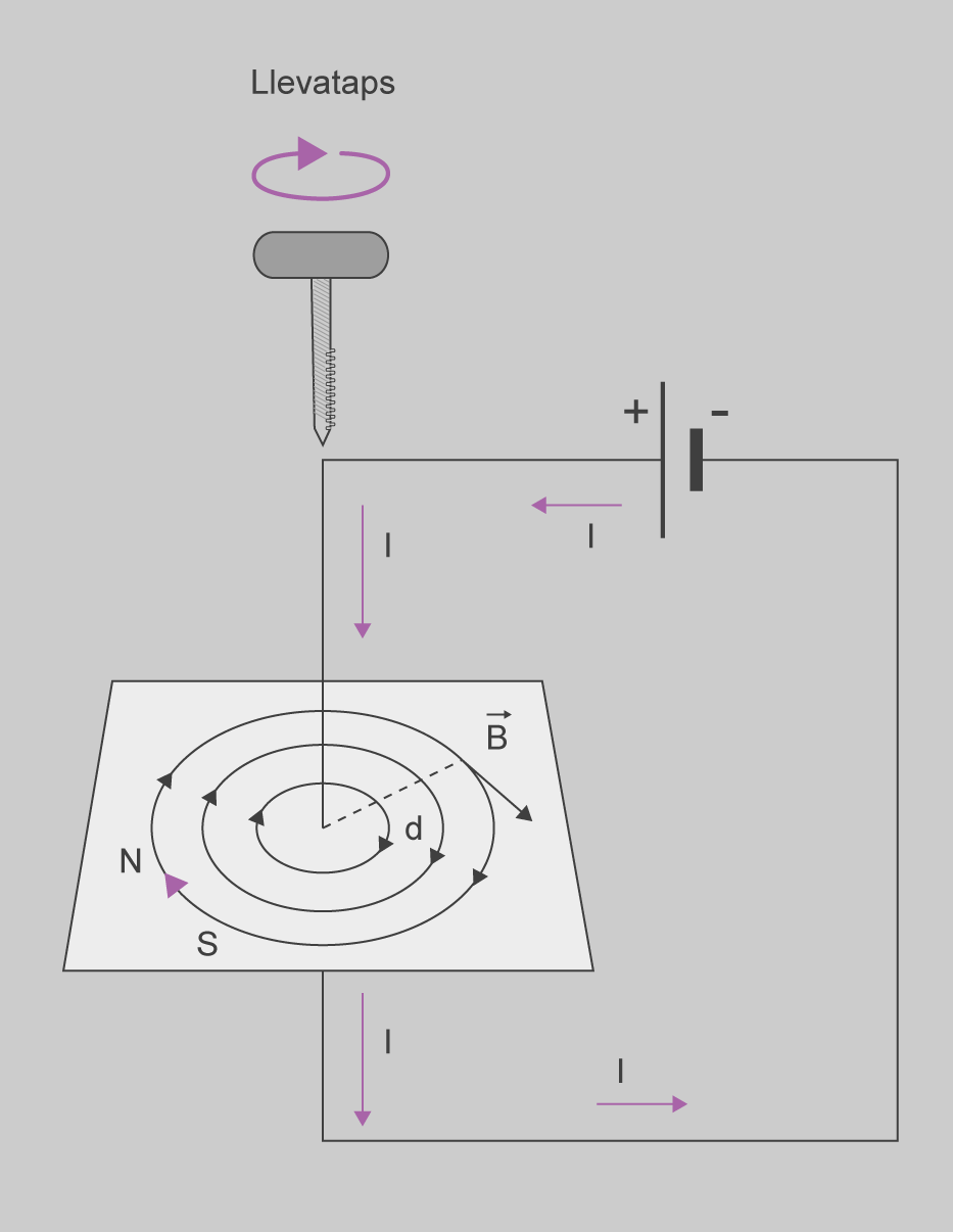 Si col·loquem un conjunt de llimadures de ferro en un suport i en travessem el centre amb un conductor pel qual passa un corrent elèctric, veurem que les llimadures es disposen de manera concèntrica al voltant del conductor i així formen les línies de força que caracteritzen el camp magnètic generat. Per determinar el sentit d’aquestes línies es fa servir la regla del cargol, del llevataps o de Maxwell, segons la qual el sentit de les línies de força és el que s’obté en fer girar el llevataps o la rosca en el mateix sentit del corrent elèctric (figura).