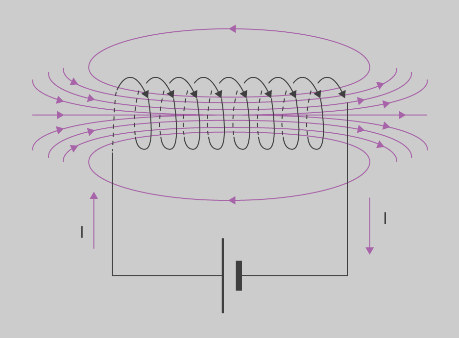 Una bobina (solenoide) constitueix una sèrie de conductors en forma d’anell, l’un disposat al darrera de l’altre. Per tant, el camp de cada espira se suma al de la següent i es genera un camp uniforme i molt intens en l’eix central de la bobina. El sentit de les línies d’inducció el continua determinant la regla del llevataps (vegeu la figura).