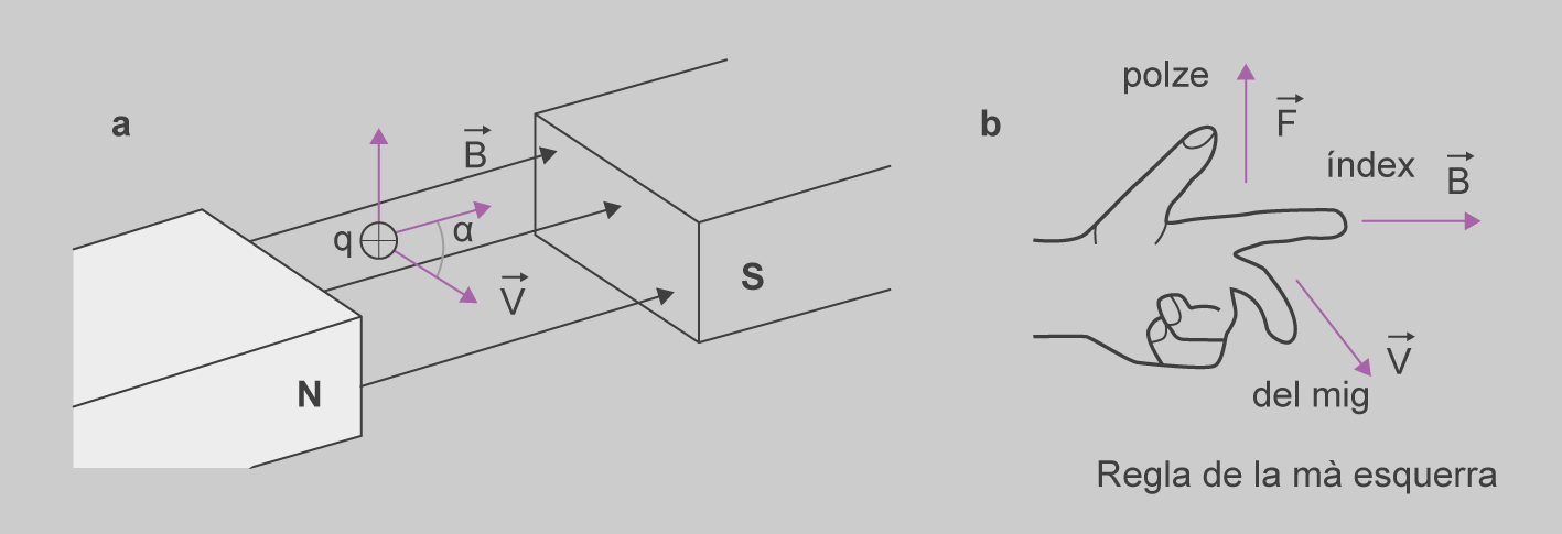 Si una partícula carregada amb una càrrega elèctrica +q es mou dins un camp magnètic B a una velocitat v, es genera una força F (vegeu la figura a).