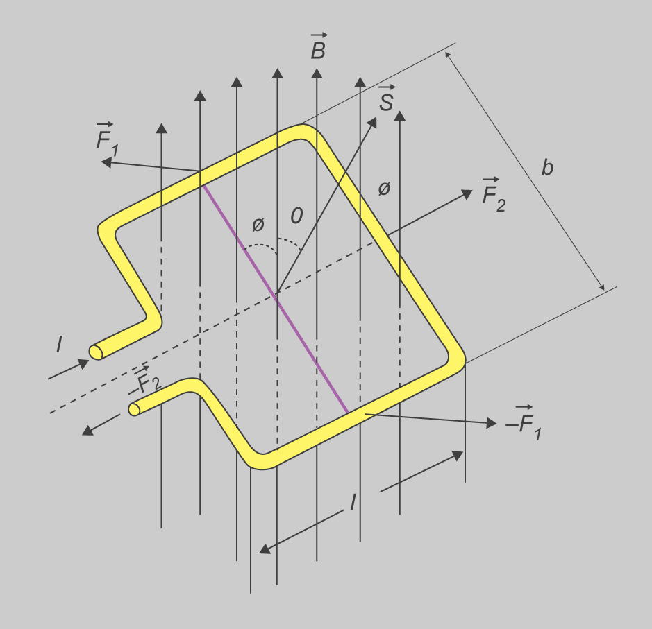 Aquí, F és la força generada i expressada en N, I és el corrent expressat en A, B és el camp magnètic expressat en T, S és l’àrea de l’espira expressada en m2 i θ és l’angle que formen el vector de camp magnètic i el vector perpendicular a l’espira.