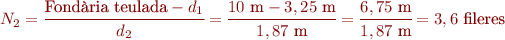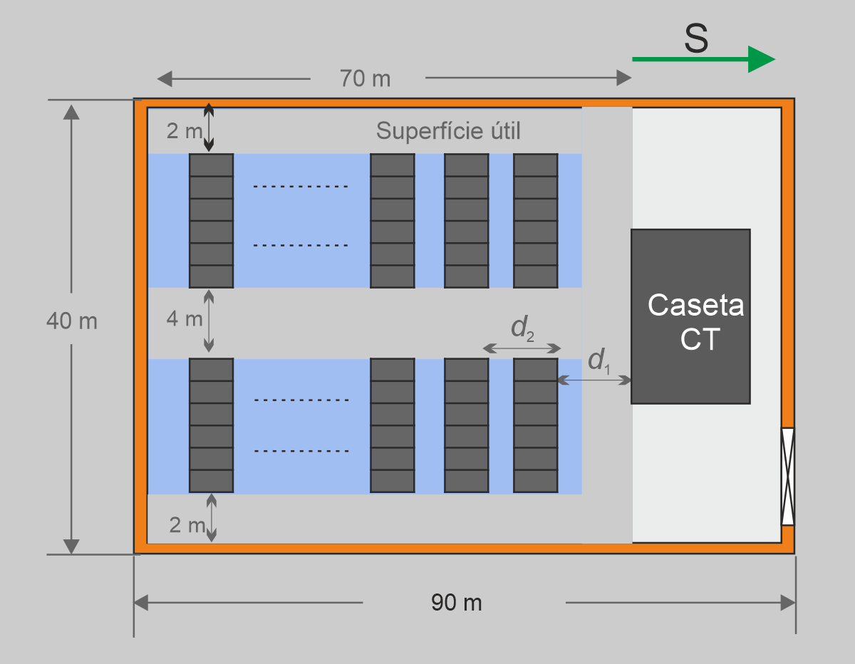 El nombre de fileres (N2) que poden instal·lar-se, tenint en compte la fondària de la teulada disponible, la distància entre mòduls (d2) d’1,87 m i la distància entre la paret (d1) de 3,25 m, és de 3: