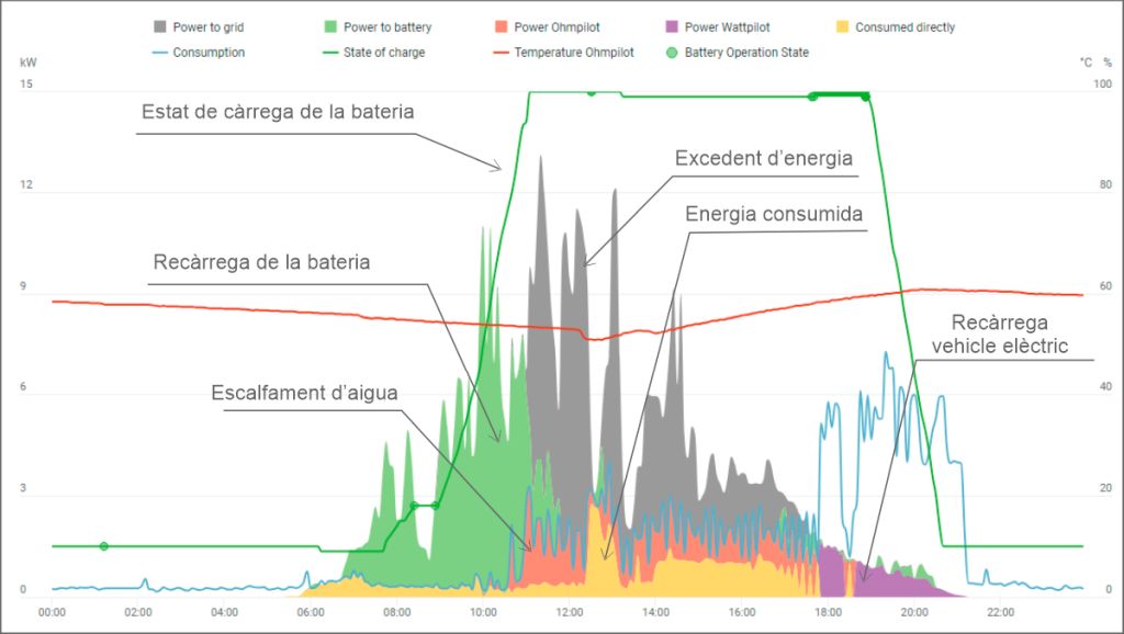 - Quan les bateries s’han carregat completament, l’excedent es lliura a la xarxa.