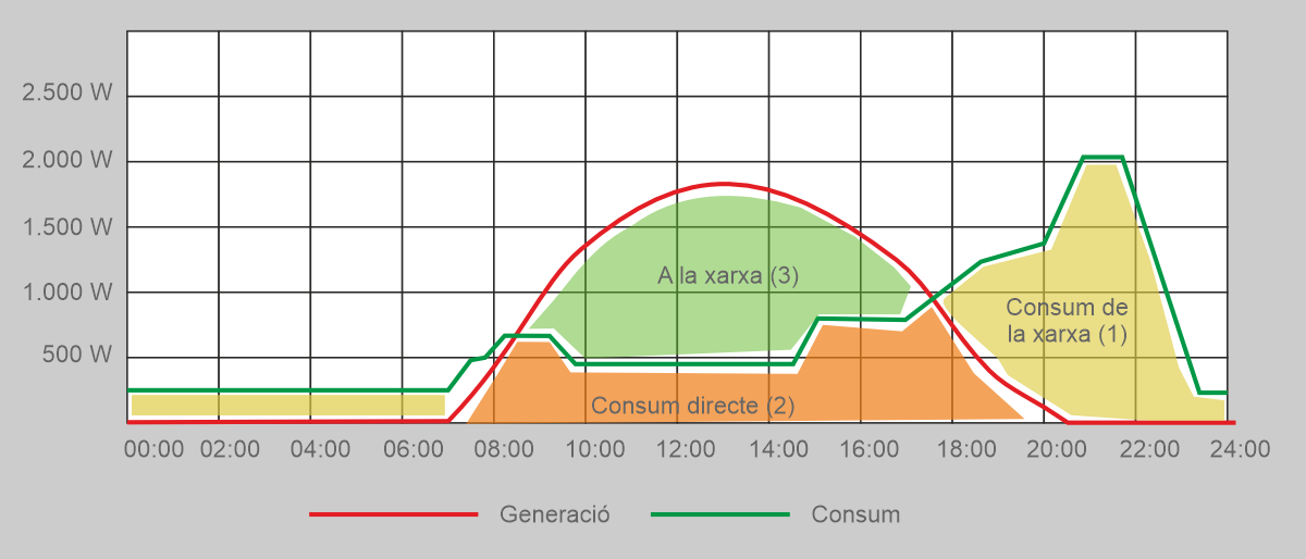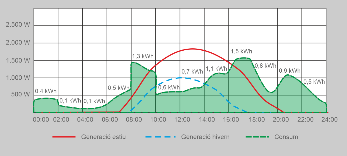 La figura mostra la corba de consum i generació d’aquest tipus d’instal·lació.