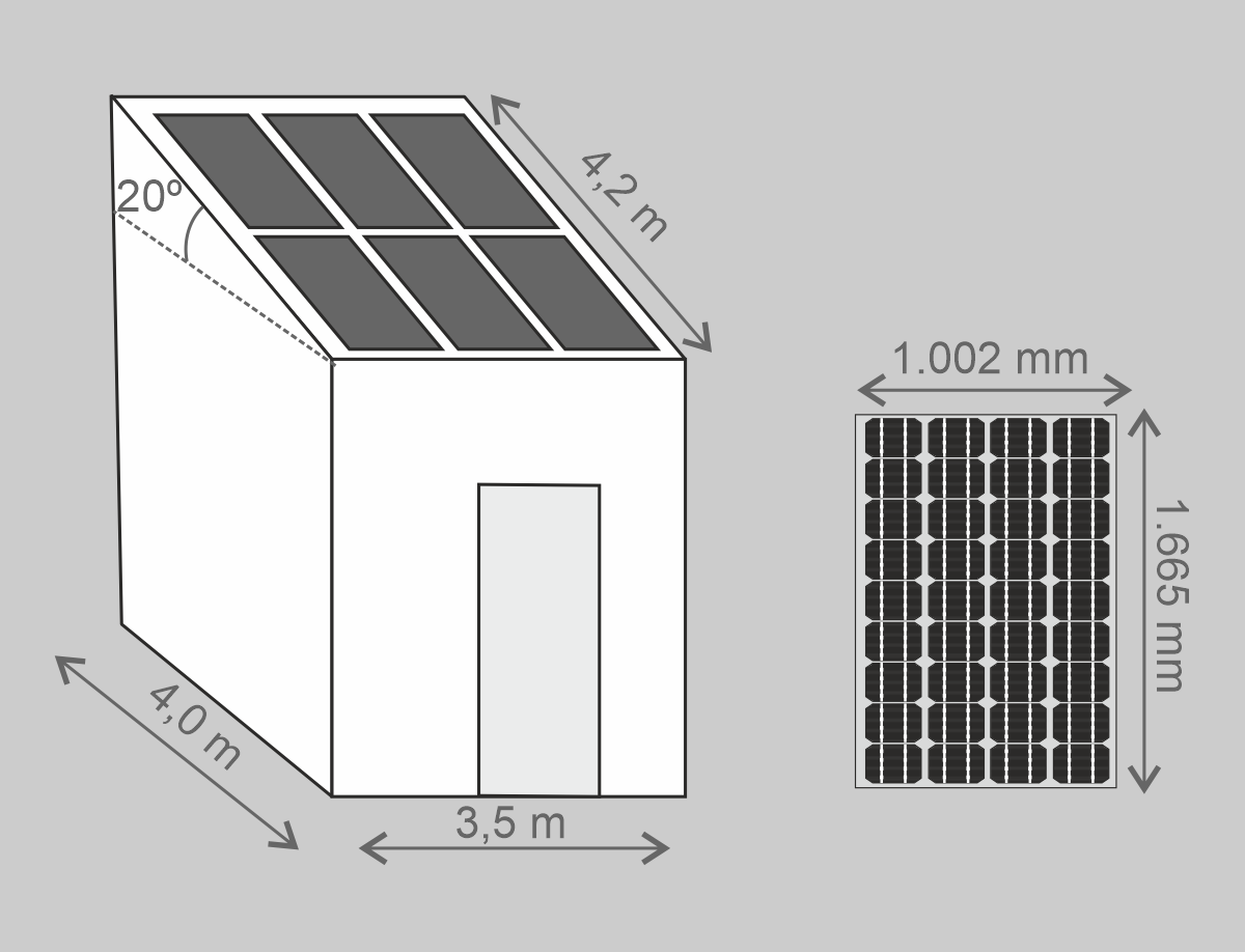 Aprofitant la inclinació del sostre de la caseta de la teulada, s’instal·larà una connexió en sèrie de panells independents. En aquest cas la inclinació dels panells ve determinada per la inclinació de la teulada de la caseta i la solució adoptada es mostra a la figura.