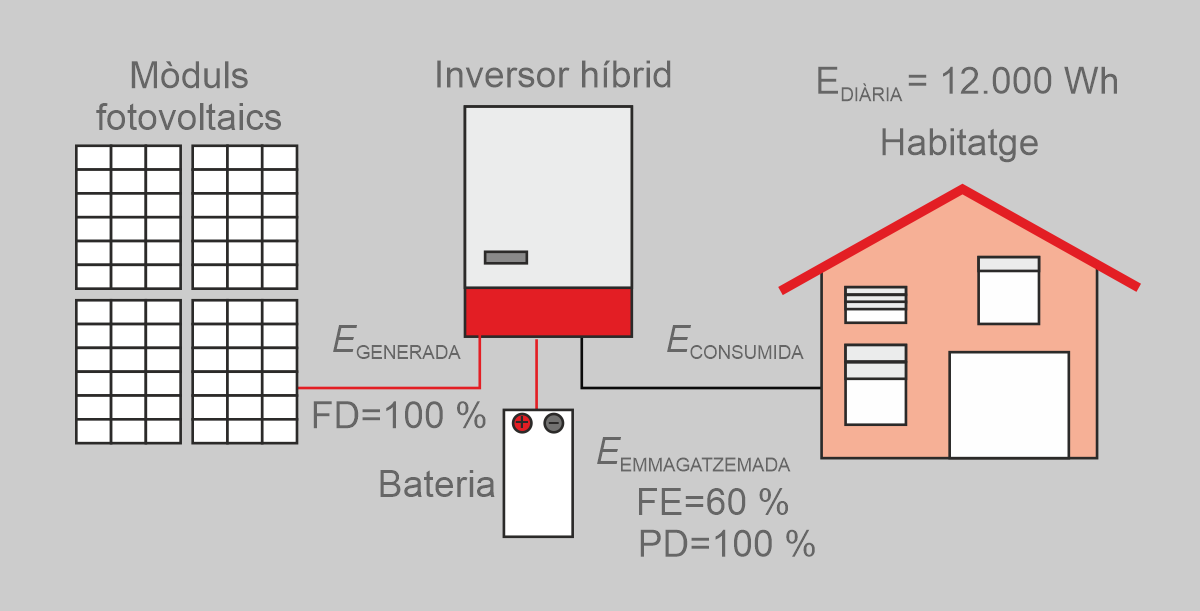 La figura mostra l’esquema de principi d’aquesta tipologia d’instal·lació. Un cop el camp fotovoltaic ha generat l’energia i assolida la demanda elèctrica de l’edifici, en el cas que es produeixin excedents es procedeix a la càrrega de les bateries.