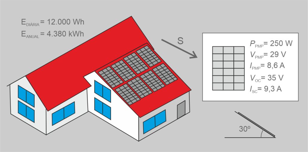 En aquest exemple determinarem la disposició dels panells sobre la superfície d’una teulada per tal subministrar la potència calculada durant el disseny, segons la distribució que podeu veure a la figura.