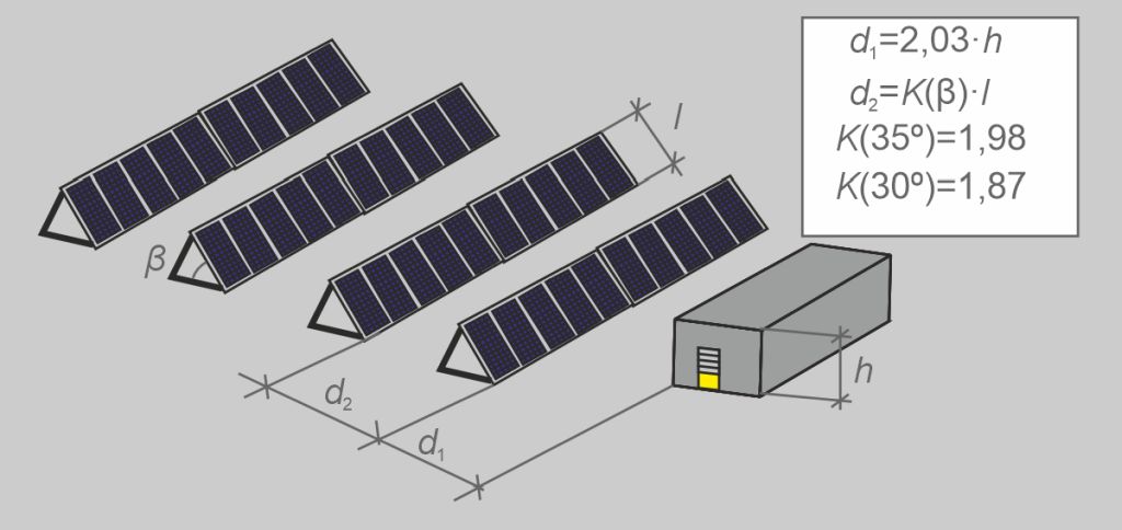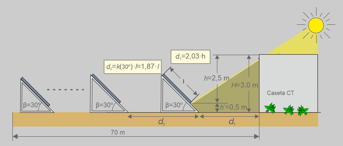 La distància entre mòduls (d2), per a una inclinació de 30° i una longitud del mòdul d’1,002 m és d’1,82 m: