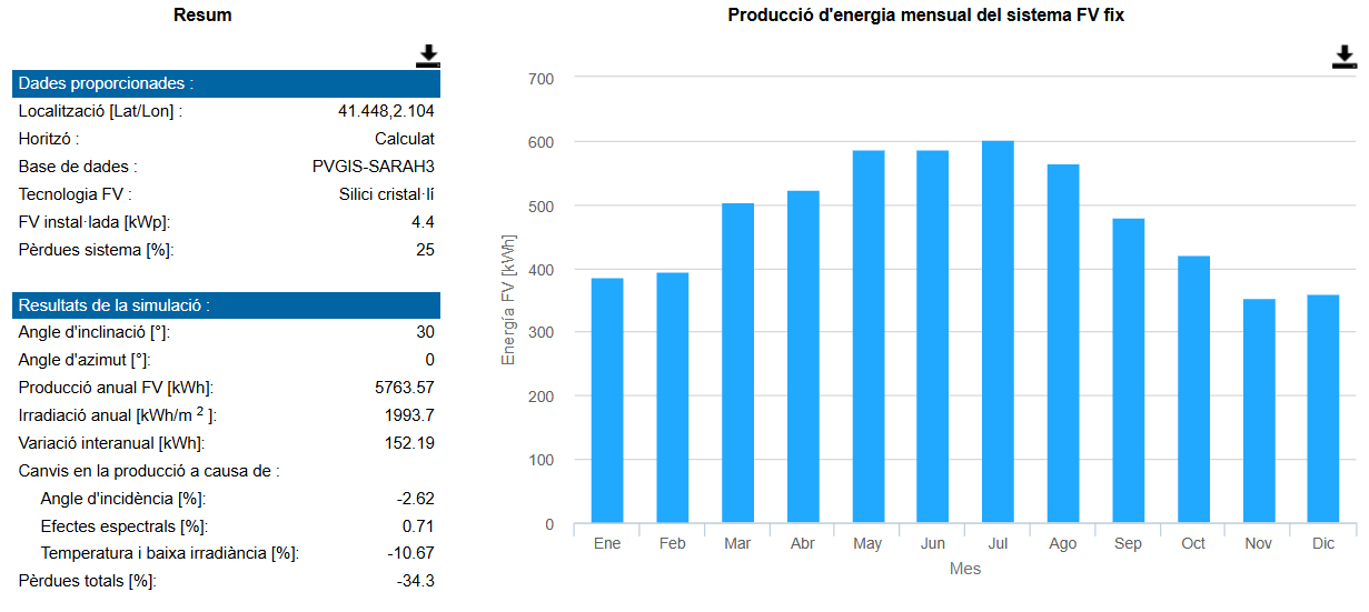 La taula resumeix la radiació anual mitja en el lloc d’instal·lació (Tarragona).