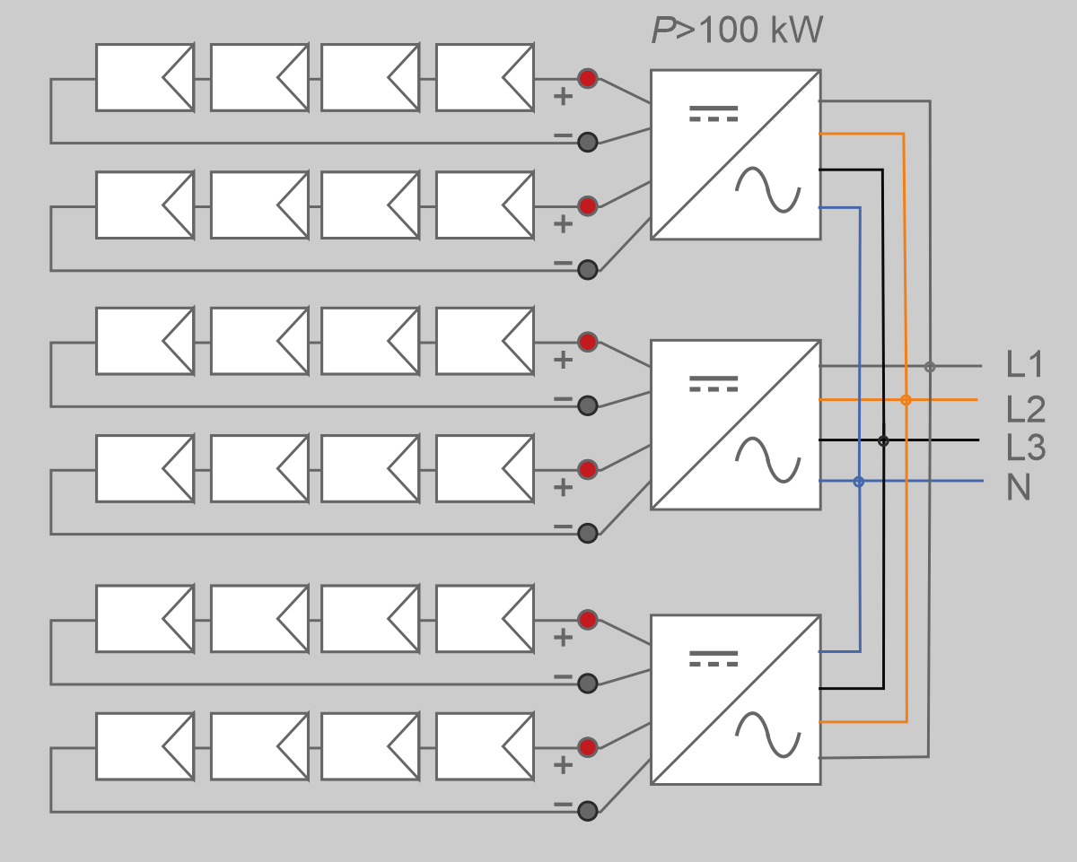 En les centrals solars de grans dimensions, com podeu veure a la figura, es divideix el camp fotovoltaic en diferents parts (subcamps), cadascuna proveïda d’un inversor propi al qual es connecten diferents cadenes en paral·lel a diferents punts d’entrada MPPT.