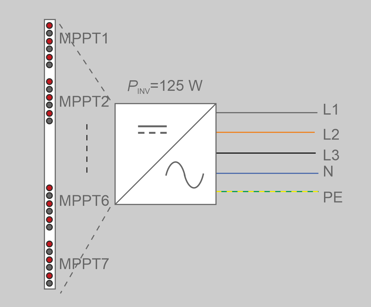 La utilització d’un inversor o MPPT per cada cadena limita els problemes d’acoblament entre mòduls i inversors i la reducció del rendiment de la planta a conseqüència de l’ombrejat o l’exposició al Sol no uniforme.