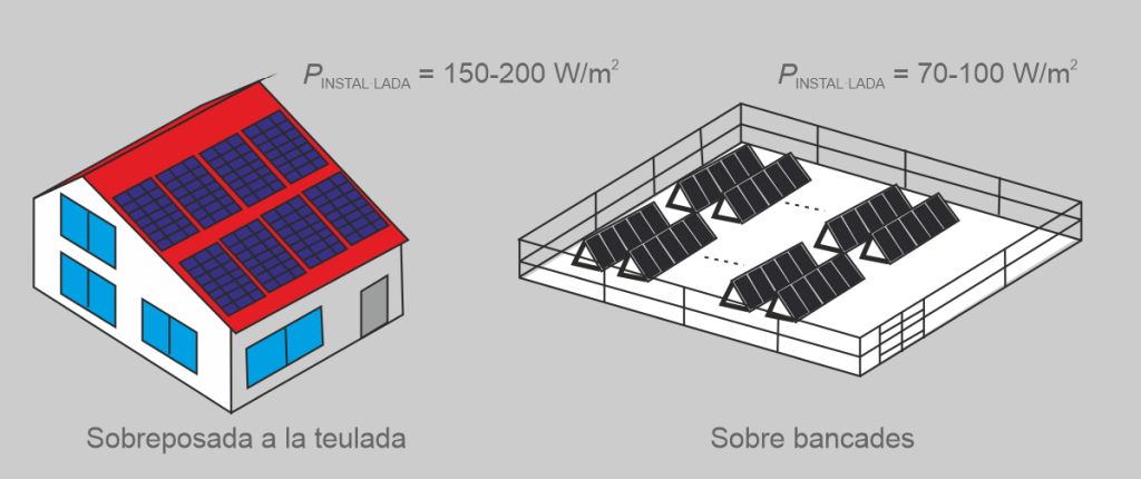 - Instal·lació sobre la teulada amb panells fixos i sobre una caseta coplanar.