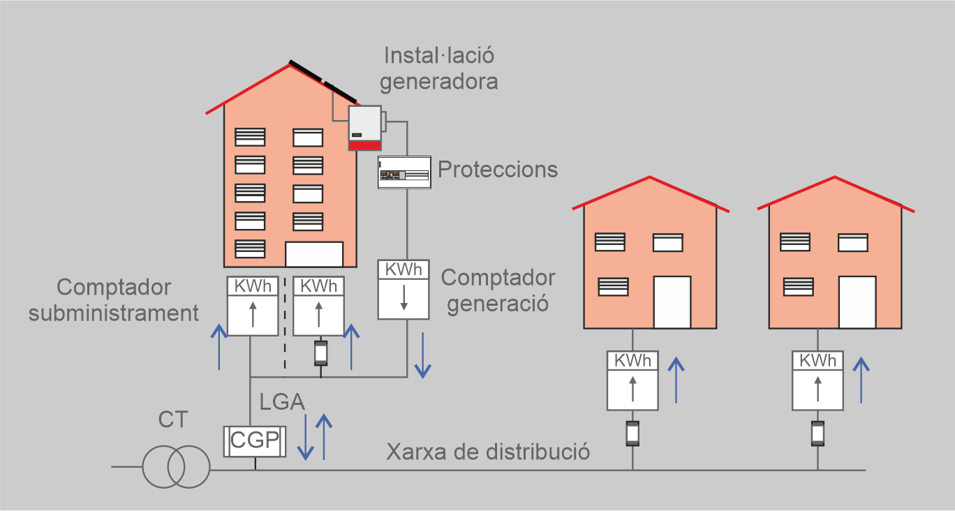 - En la xarxa interior. La instal·lació de generació es connecta a la xarxa interior dels consumidors, és a dir, el conjunt de circuits interiors que podem trobar a la comunitat de veïns (figura).