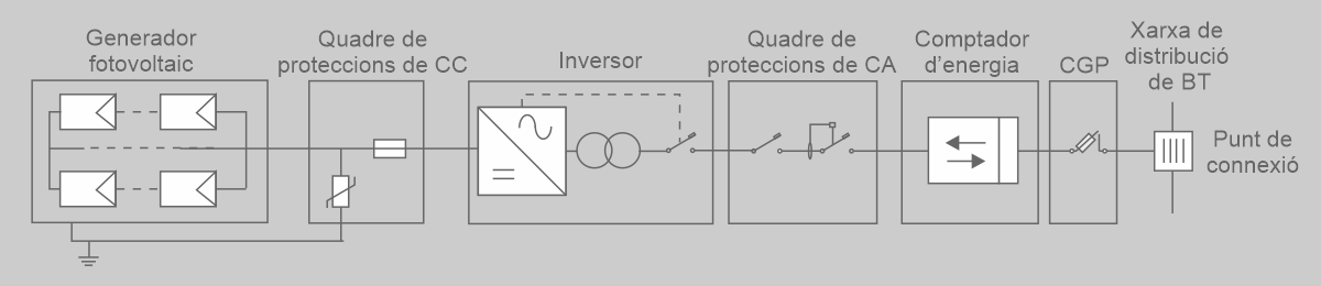 La figura mostra una instal·lació solar fotovoltaica connectada a la xarxa, l’objectiu de la qual és la producció d’energia per a la venda elèctrica.