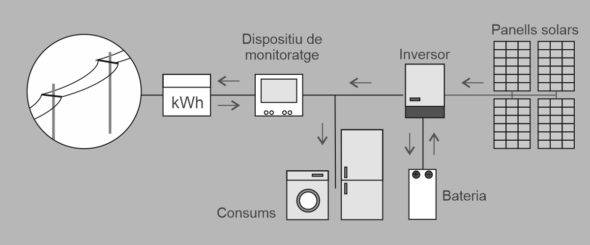 - Il·lustració representativa d'un usuari amb una instal·lació fotovoltaica connectada a la xarxa.
