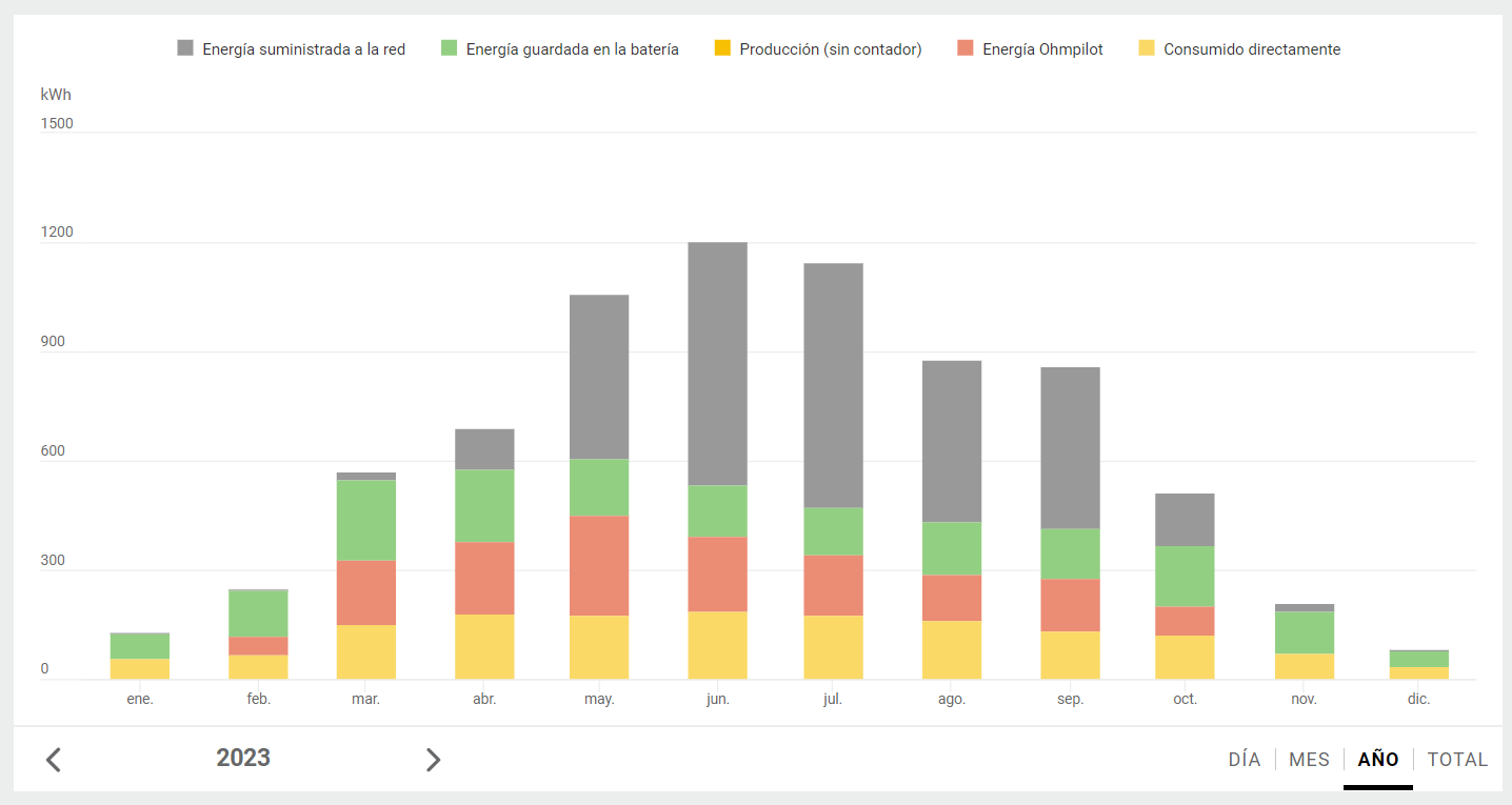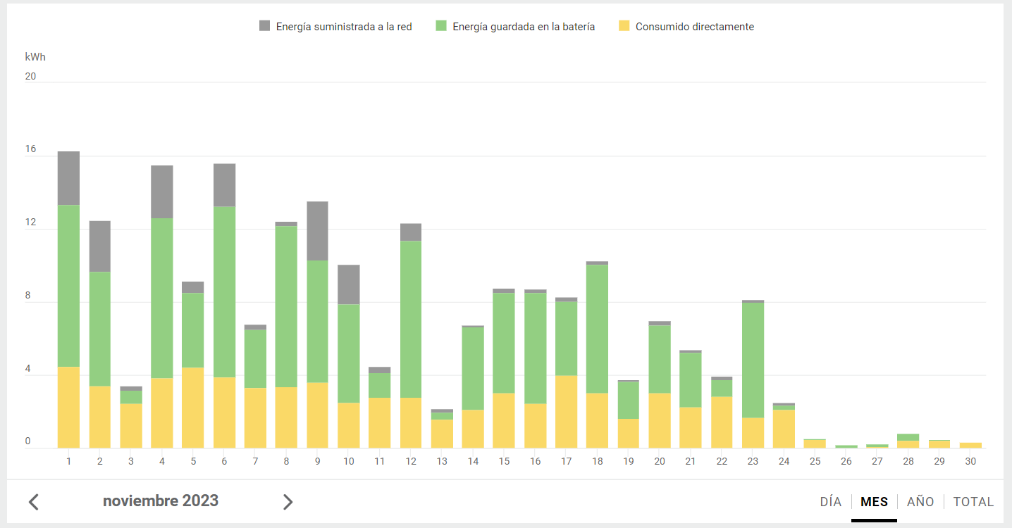 La figura mostra el balanç energètic d’una instal·lació on es compara l’energia generada, emmagatzemada en les bateries i la consumida de manera diària durant un mes.