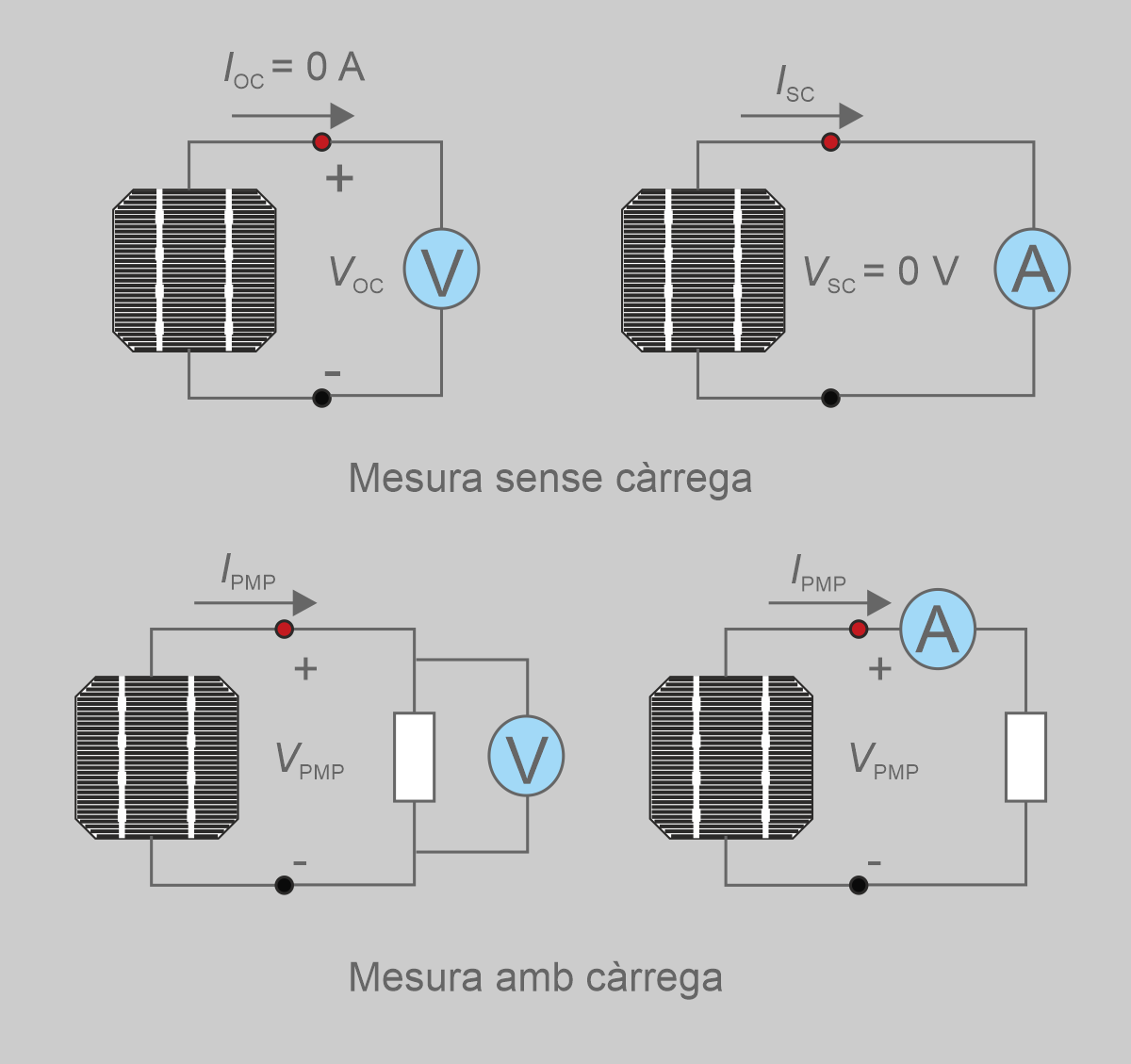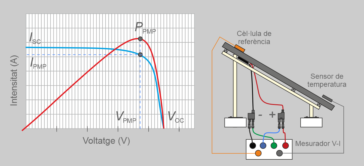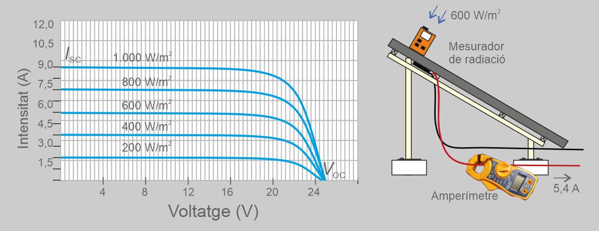 - Radiació solar al plànol dels mòduls mesurada amb una cèl·lula o mòdul de tecnologia equivalent.