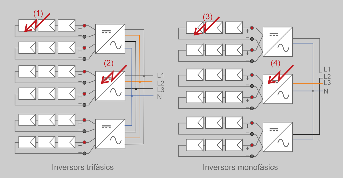 - Utilització de panells fotovoltaics o conductors amb una tensió d’aïllament menor que la tensió màxima del camp fotovoltaic.