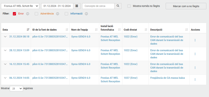 El sistema de monitoratge, com podeu veure a la figura pot configurar-se per generar missatges d’avis quan es produeixen errades en la instal·lació.