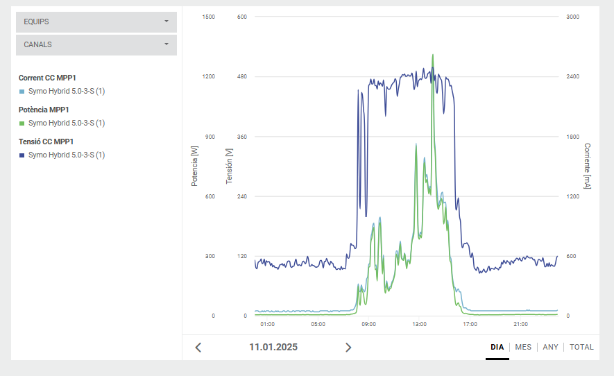 En la figura podeu veure el monitoratge d’una instal·lació. En aquest gràfic podem observar els següents paràmetres: