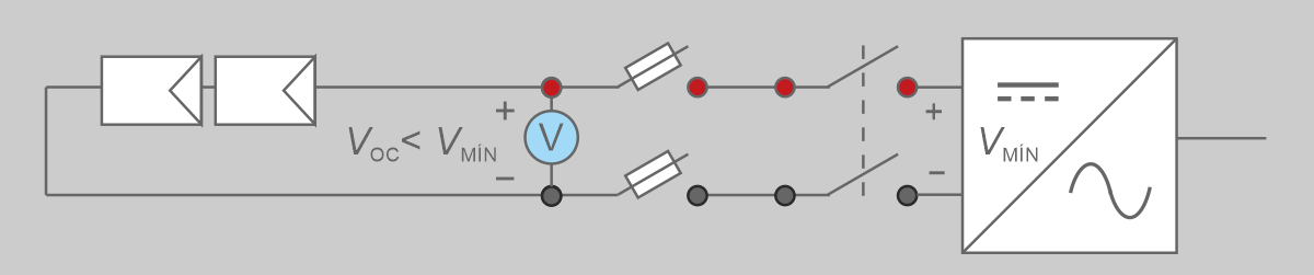 Per altra banda, el camp fotovoltaic ha d’assolir una tensió mínima (VMÍN) que permeti la posada en servei de l’inversor (figura). Aquesta tensió pot ser massa baixa quan les condicions d’irradiació solar són baixes o hi ha brutícia en els mòduls fotovoltaics.