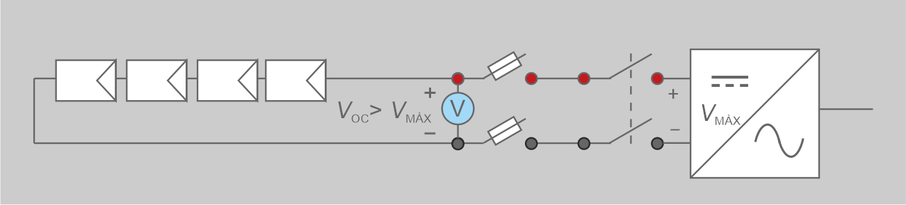- Si la tensió de CC és més gran que la tensió d’entrada màxima de l’inversor, cal assegurar-se que el generador fotovoltaic estigui correctament dimensionat.
