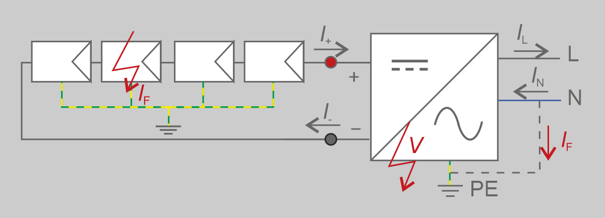 En el cas d’una fallada de la connexió de posada a terra o d’un defecte d’aïllament de la instal·lació (figura), pot aparèixer una tensió de contacte en components que normalment no estan sota tensió, que pot resultar perillosa. Un exemple clar d’aquesta situació es produeix quan un cable de connexió tallat per accident entra en contacte amb el marc d’un mòdul, provocant que una part del corrent circuli a través d’ell.