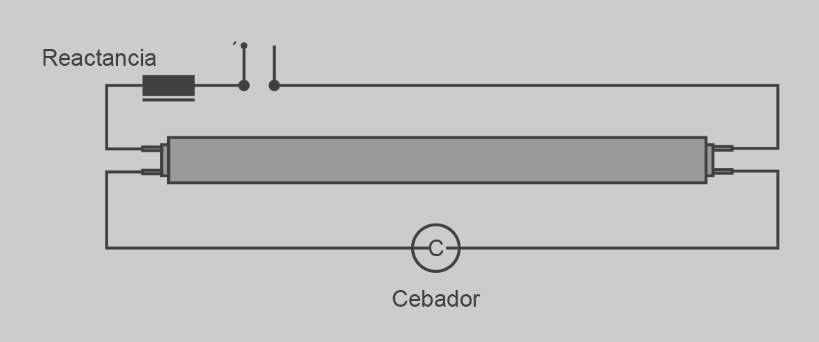 La diferència de potencial queda aplicada per mitjà de la reactància i en sèrie amb els filaments del tub. L’encebador va connectat en paral·lel amb el tub. A l’interior de l’encebador, el gas neó es comença a escalfar perquè el gas s’ionitza. Com que l’atmosfera de l’encebador s’escalfa, les làmines bimetàl·liques es corben i s’arriben a tocar. Quan l’encebador té les làmines en contacte, té el circuit tancat i fa que el corrent circuli pels filaments del tub, fet que provoca l’emissió dels electrons, que en xocar amb els àtoms de gas que conté el tub, desplacen de les seves òrbites els electrons del gas ionitzat i absorbeixen energia. Passats uns instants, els electrons desplaçats tornen a la seva posició inicial i alliberen l’energia presa amb anterioritat, en forma de radiacions, principalment ultraviolades.