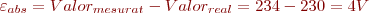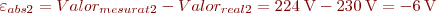 Per exemple, per trobar l’error absolut d’una mesura de tensió amb un voltímetre amb les següents dades:- Tensió mesurada: 234 V.