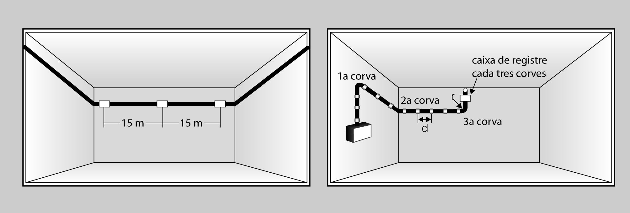Serà possible la introducció i retirada fàcil dels conductors en els tubs després de col·locar-los, i un cop fixats aquests i els seus accessoris, i es disposaran per a això els registres que es considerin convenients, que en trams rectes no estaran separats entre ells més de 15 metres (figura). El nombre de corbes en angle, situades entre dos registres consecutius, no serà superior a 3.